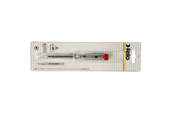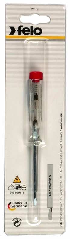 Robusni šrafciger sonde 220 – 250 V Felo 3.0 x 65 361 300 01 dužine 105 mm i dužine oštrice 65 mm. Napravljen od visoko legiranog čelika sa satin hromiranom završnom obradom. Idealan alat za majstore, električare i elektromehaničare. Isporučuje se u blister pakovanju.
