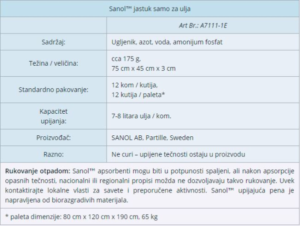 Jastuk može da upija sa svih strana. Otvoriti sa svih strana duž perforirane ivice. Jastuk se može koristiti sa otvorenim poklopcem. Poklopac će tada delovati kao rezervoar za višak ulja. Svi Sanol™ proizvodi se moraju čuvati u čvrstom originalnom pakovanju do upotrebe.
