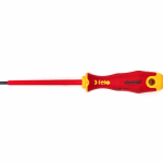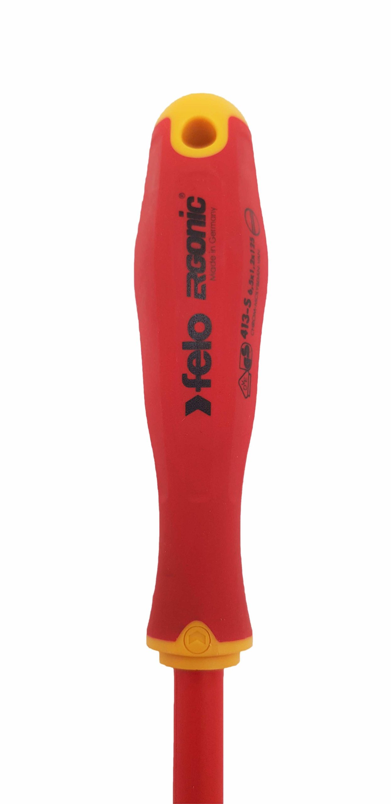 Dielektrični šrafciger Felo Ergonic VDE E-Slim slot 6,5 x 125 41396590, dužinom oštrice 125 mm i ukupnom dužinom 240 mm Felo 413 serije Ergonic E-Slim 41396590. Ima tanko Slim sečivo i omogućava vam da radite sa duboko udubljenim pričvršćivačima. Od hrom-molibden čelika visoke čvrstoće sa fosfatnim premazom.