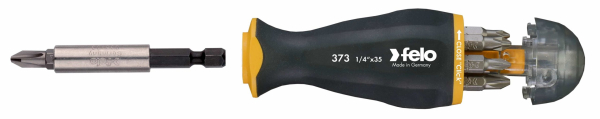 Držač nastavka za šrafciger tipa magazina sa magnetom može zameniti ceo set šrafcigera. Ispod šestougla 1/4 C 6.3. Komplet držača uključuje 8 bitova k 25 mm. Ergonomska drška od meke sintetičke smole sa odlaganjem bitova. Dužina sa produžetkom – 220 mm. Produžni kabl za ručnu i maŠinsku upotrebu.